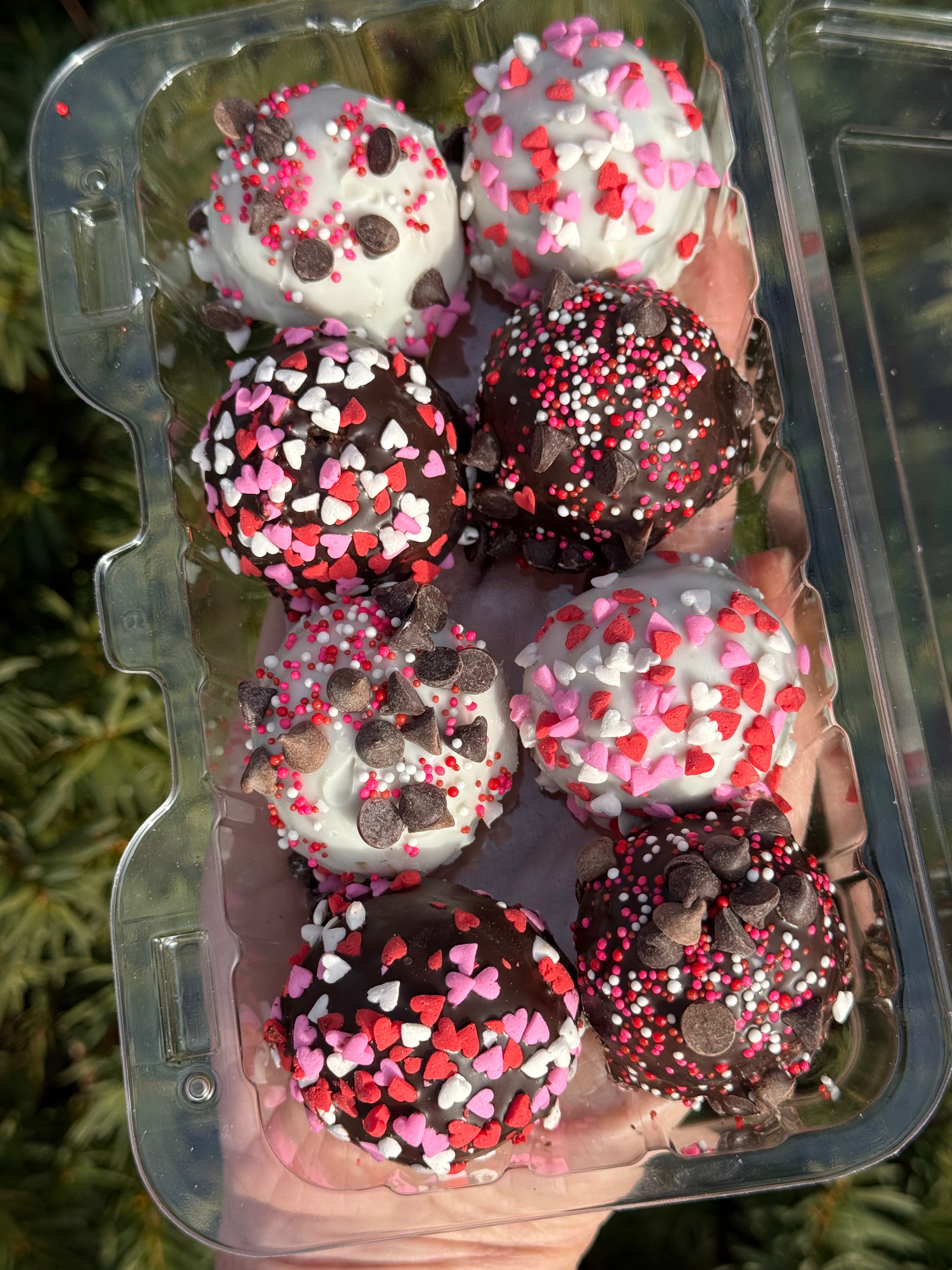 What's as a good as cookies...cookie dough truffles. This unique treat starts with a ball of edible cookie dough. It is then dipped in both white and and dark chocolate then sprinkled with our signature valentines day sprinkle mix. Whether you're gifting them to a loved one or indulging yourself, these truffles are a sweet, playful way to celebrate Valentine's Day!